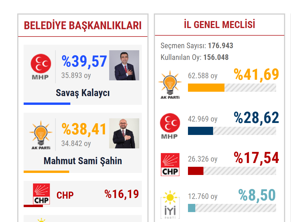 Karaman'da kıyasıya geçen yarışın galibi MHP'nin adayı Savaş Kalaycı olurken, AK Parti'nin adayı Mahmut Sami Şahin 1000 oy farkla başkanlık yarışını kaybetti. İl Genel Meclisinde ise AK Parti'nin üstünlüğü var.