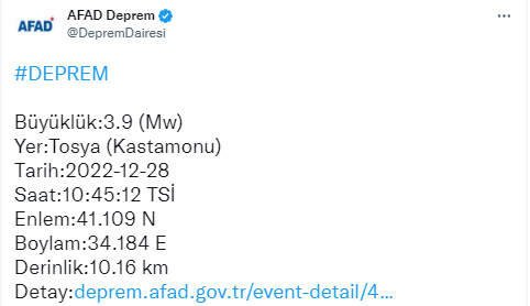 AFAD, Kastamonu’da 3.9 şiddetinde deprem meydana geldiğini açıkladı. Depremin merkez üssünü Tosya Kastamonu olarak açıklayan AFAD, depremin yerin 10.16 kilometre derinliğinde meydana geldiğini duyurdu.