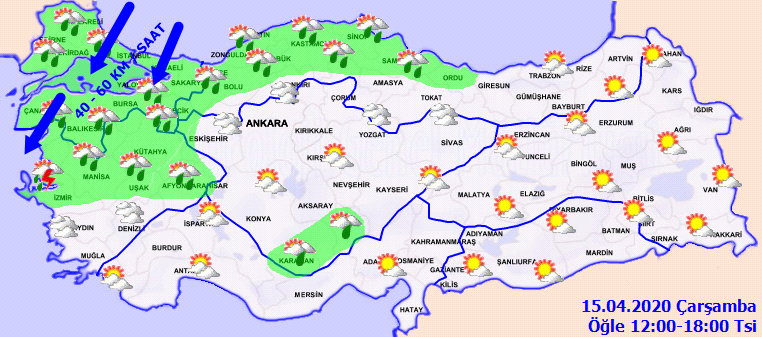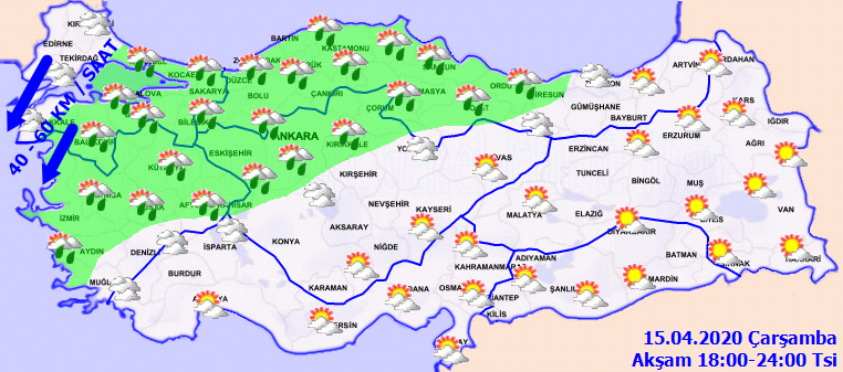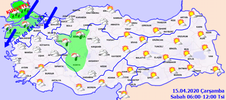 MGM tarafından yapılan son değerlendirmeye göre , ülkemizin kuzey ve batı kesimleri parçalı ve çok bulutlu, Marmara, Ege, İç Anadolu'nun kuzeybatısı, Batı ve Orta Karadeniz, Doğu Karadeniz kıyıları ile Konya, Karaman, Niğde, Yozgat, Kırşehir ve Kırıkkale çevrelerinin sağanak yağışlı geçeceğüi , diğer yerlerin parçalı ve az bulutlu geçeceği bildirildi.
