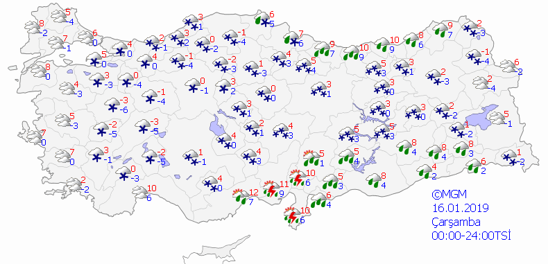 Meteoroloji Genel Müdürlüğü 'nden son dakika uyarıları geldi. MGM resmi sayfasından yapılan uyarılarda bazı bölgeler için şiddetli yağış uyarısına yer verildi. İşte 16-17-18-19-20 Ocak 2019 Türkiye geneli haritalı hava durumu.