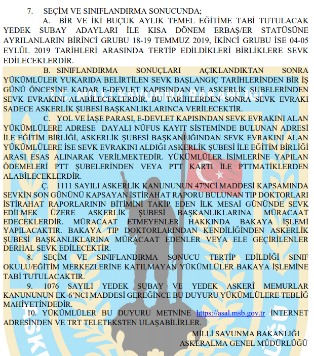6. SEÇİM VE SINIFLANDIRMA SONUÇLARI MİLLÎ SAVUNMA BAKANLIĞINCA 12 TEMMUZ 2019 TARİHİNDE E-DEVLET KAPISINDAN YÜKÜMLÜLERE DUYURULACAKTIR. SINIFLANDIRILAN YÜKÜMLÜLER TEKRAR SINIFLANDIRMA İŞLEMİNE TABİ TUTULMAYACAKTIR.