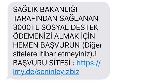 Dolandırıcılar gönderdikleri mesajda, "Sağlık Bakanlığı tarafından sağlanan 3 bin lira sosyal destek ödemenizi almak için hemen tıklayınız, diğer sitelere itibar etmeyiniz" ifadelerini kullanıyor ve mesajın sonuna bir de link ekliyor.