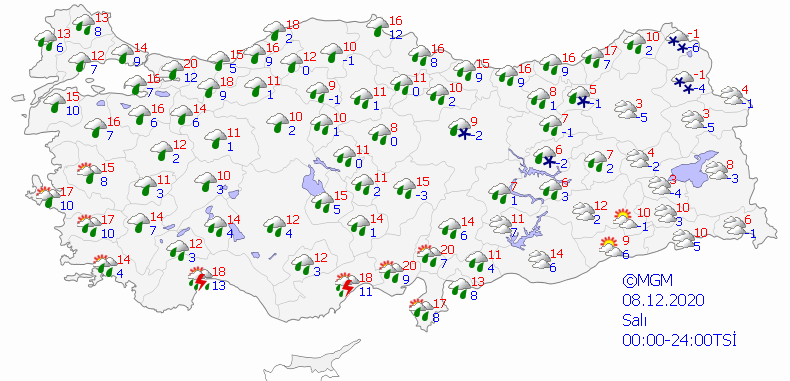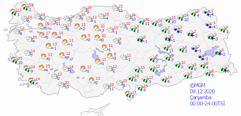 Meteoroloji Genel Müdürlüğü tarafından bir son dakika açıklaması yapıldı. Yapılan açıklamada bugün ve yarın bazı şehirlerde kar yağışı beklendiğine yer verildi. MGM tarafından yayımlanan hava tahmin raporunda ülkenin genelinde parçalı ve çok bulutlu, Marmara, Ege, Akdeniz ve Batı Karadeniz ile Ankara, Esk şehir, Konya ve Malatya çevrelerinin yağmur ve sağanak yağışın, Kars ve Iğdır çevrelerinin ise karla karışık yağmur ve hafif kar yağışlı geçeceği bildirildi. Yağışların öğle saatlerinden sonra Muğla ve Antalya ile Aydın'ın kıyı kesimlerinde yer yer kuvvetli sağanak ve gök gürültülü sağanak şeklinde olması bekleniyor. İç kesimlerde sabah erken saatlerde buzlanma ve don olayı ile birlikte pus ve yer yer sis görülmesi bekleniyor.