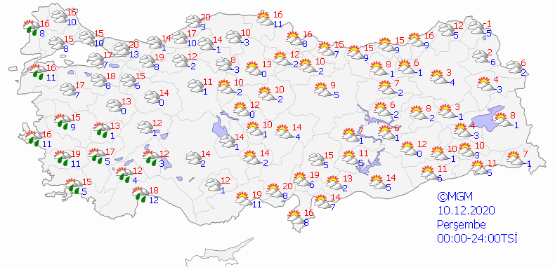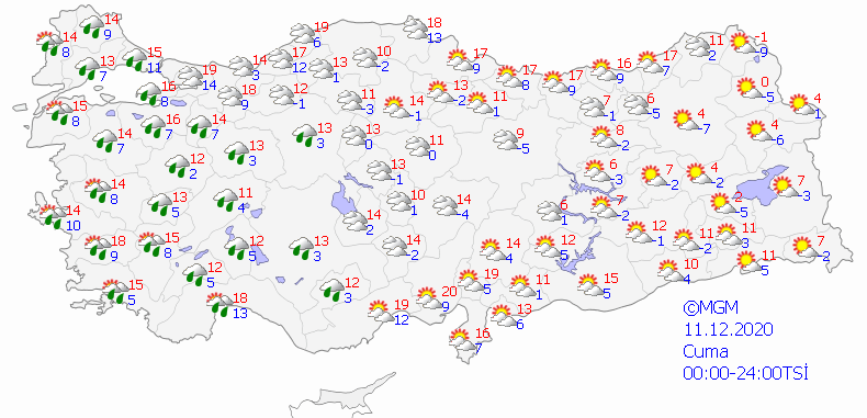 Parçalı ve çok bulutlu, Kars çevrelerinin sabah ve akşam saatlerinde hafif kar yağışlı, Iğdır çevrelerinin yağmur ve karla karışık yağmurlu, Malatya'nın gece saatlerinde aralıklı yağmurlu geçeceği tahmin ediliyor. Sabah ve gece saatlerinde buzlanma ve don olayı ile birlikte pus ve yer yer sis görülmesi bekleniyor.