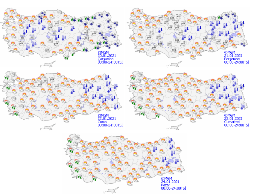 Meteoroloji Genel Müdürlüğü tarafından bir son dakika açıklaması yapıldı ve hava sıcaklıklarının artmaya başlayacağına yer verildi. Son dakika açıklamasında, ülkenin kuzey ve doğu kesimlerinin parçalı ve çok bulutlu, Doğu Karadeniz, Doğu Anadolu’nun güney doğusu, Güneydoğu Anadolu'nun güneyi, Zonguldak, Bartın, Karabük, Ordu, Bingöl, Erzurum, Iğdır çevreleri ile Kastamonu'nun kıyı kesimlerinin karla karışık yağmur ve kar yağışlı, Hatay çevrelerinin yağmur ve sağanak yağışlı, diğer yerlerin az bulutlu geçeceği tahmin ediliyor. İç ve doğu kesimlerde kuvvetli buzlanma ve don, kıyı kesimlerde hafif don olayı ile birlikte yer yer sis ve pus hadisesi beklendiğine yer verildi.