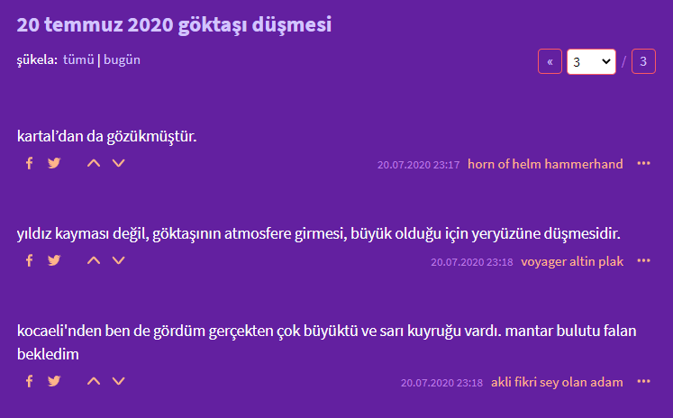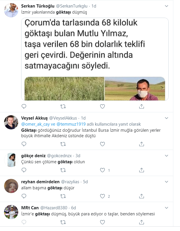 Ekşisözlük'teki bir kullanıcı, "saat 22.45 civarı, izmir’den doğu yönünde gördüğümüz aşırı parlak göktaşı düşmesidir. sönmeden düştüğünü düşünüyorum. hayatımda bu kadar parlak yıldız kayması görmedim." ifadelerini kullanırken, bir başka kullanıcı Caddebostan sahilinde olaya şahit olduğunu , Sakarya'daki bir kullanıcı ise 3-4 saniye gökyüzünde parlaklık gözlemlediğini belirtti.