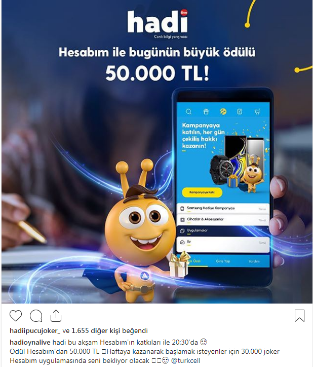 Bu akşam saat 20,30 'da yapılacak Hadi yarışması, HESABIM'ın sponsorluğunda yapılıyor. Yarışma öncesi Hadi 30 bin joker dağıtıyor.
