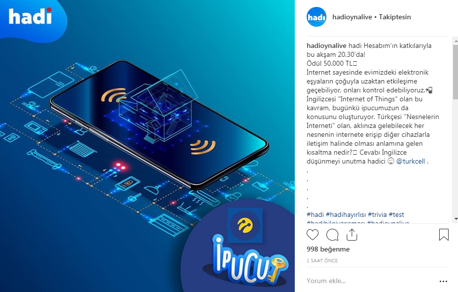 Hadi 17 Aralık saat 20,30 yarışması Hesabım'ın sponsorluğunda yapılacak. Yarışma öncesi 30 bin joker kodu yayımlandı. Bu kod tükendi ama Hadi, yeni joker kodu yayımladı. İpucu sorusu da yayımlandı. Yayımlanan ipucu sorusunda Nesnelerin İnterneti anlamındaki Internet of Things 'in kısaltmasının ne olduğu soruldu. İşte cevap