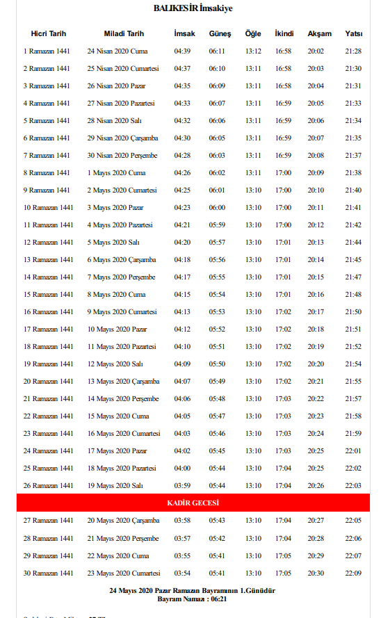 Artvin , Aydın ve Balıkesir 2020 imsakiyesi.