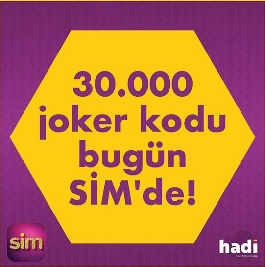 30.000 TL ödüllü hadi için 30.000 joker kodu şu an SİM'de seni bekliyor! Hemen SİM uygulamasına git, 30.000 şanslı kişiden biri ol ve joker kodunu kap