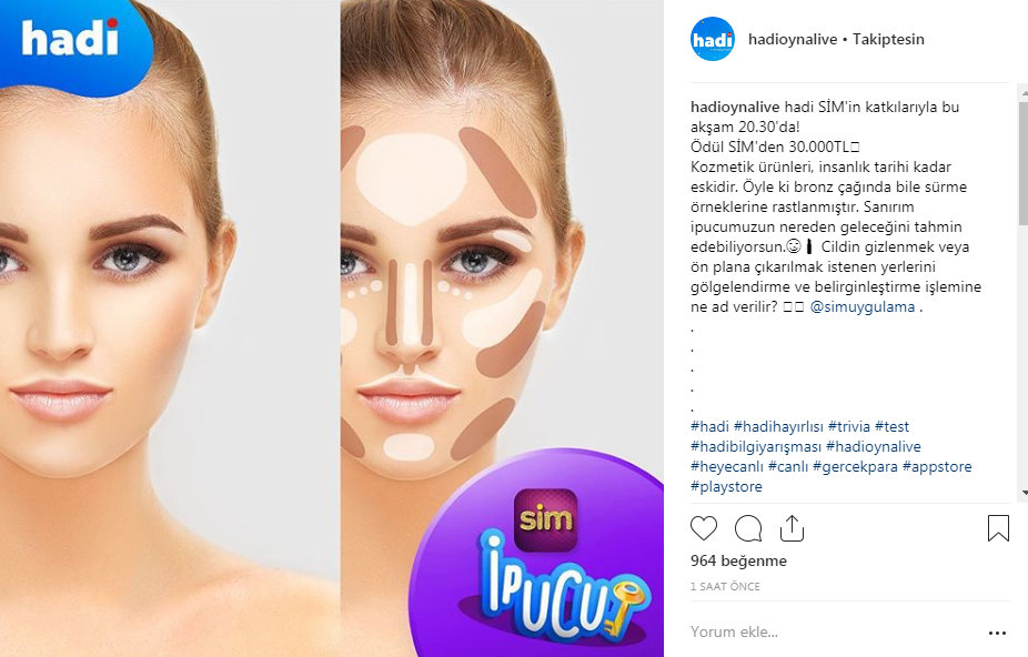 Hadi SIM özel yarışmasında 30 bin joker dağıtacak. Joker kodu ve ipucu sorusu araştırılıyor. Joker kodu yayımlandı. Yayımlanan ipucu sorusunda, Cildin gizlenmek veya ön plana çıkarılmak istenen yerlerini gölgelendirme ve belirginleştirme işlemine ne ad verilir? ifadelerine yer verildi.