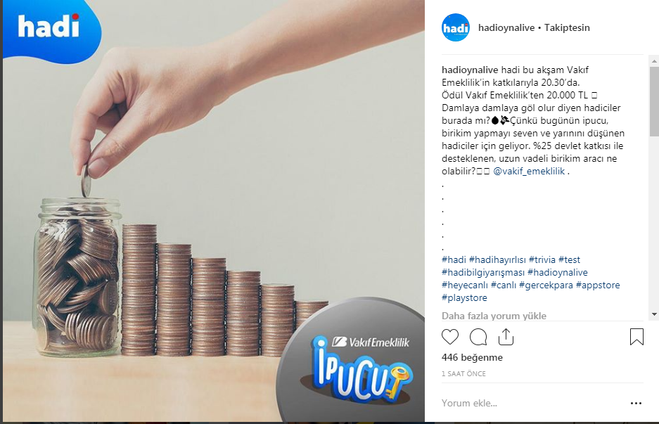 Hadi, bu akşam saat 20,30 'da Vakıf emeklilik sponsorluğunda 20 bin TL'lik yarışması ile yapılacak. Gerçek para ödüllü bilgi yarışması uygulamasında bu akşamki yarışmada katılımcılara 12 soru sorulacak.