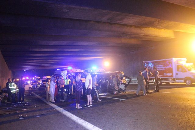 İki aracın çarpışması sonucu feci bir kaza meydana geldi. Çarpışmanın şiddetiyle içinde 14 kişinin bulunduğu hafif ticari araç yola savrulurken, diğer otomobil de bariyerlere çarparak durabildi. Otomobilin sürücüsü kazanın ardından olay yerinden kaçtı.