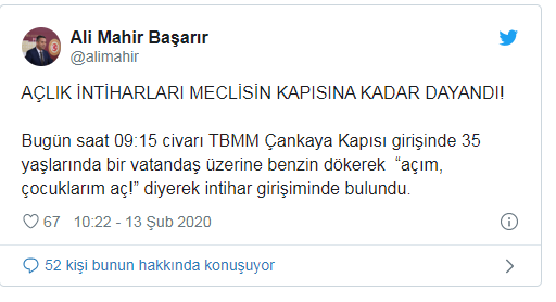 Konu ile ilgili açıklamada bulunan CHP Mersin Milletvekili Ali Mahir Başarır, “Açlık intiharları Meclis’in kapısına dayandı” dedi ve şunları söyledi: